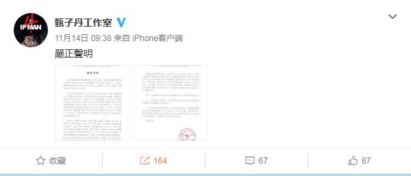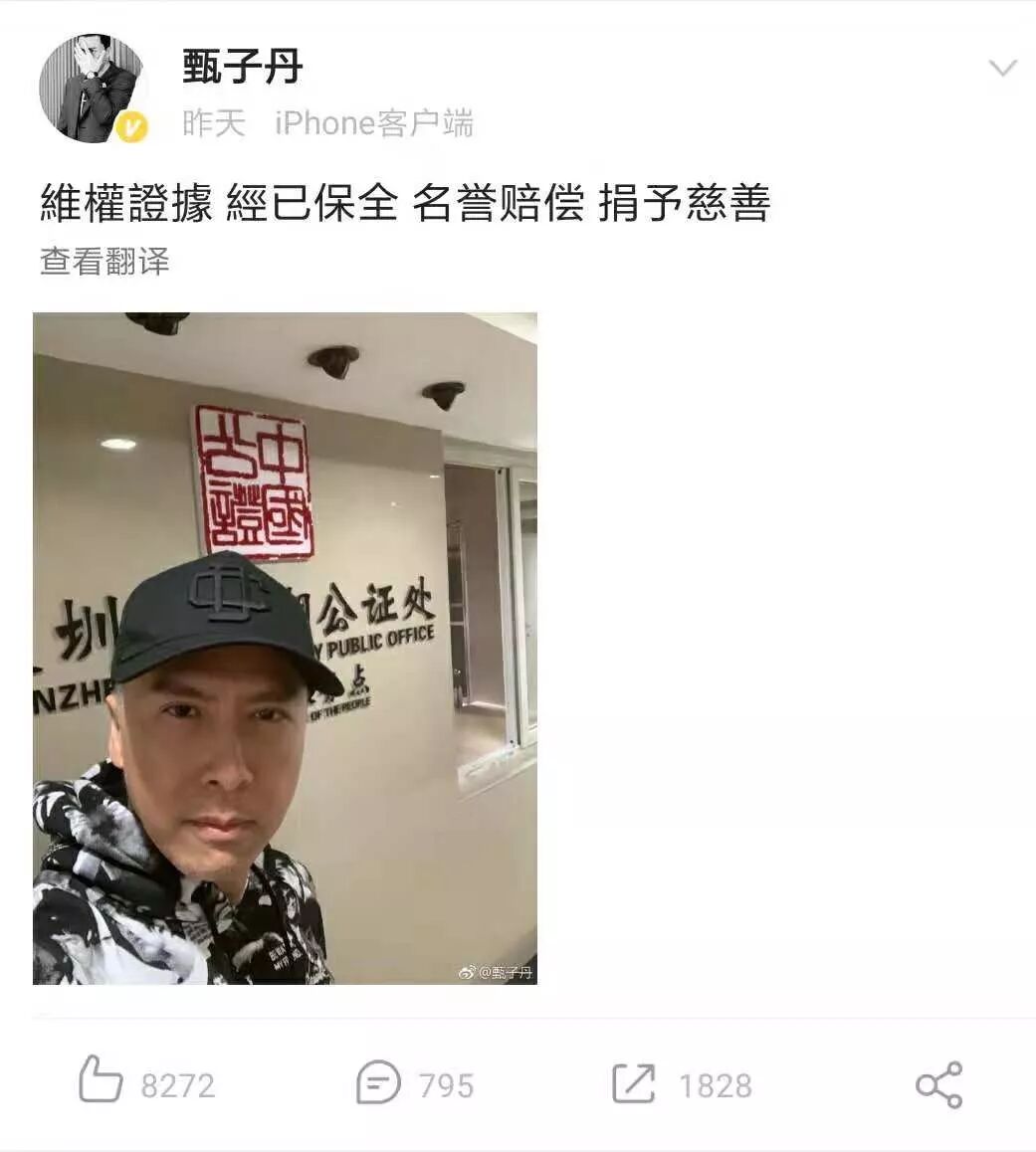 紧接着,甄子丹在其个人微博晒出一张在深圳某公证处的自拍照片,并配文称:“维权证据,经已保全;名誉赔偿,捐予慈善!”