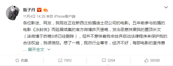 甄子丹还说,即使片方删掉恶意抹黑的官博,也不意味着自己会放弃继续维权,同时表示自己出演本片的片酬尾款一直没有拿到。